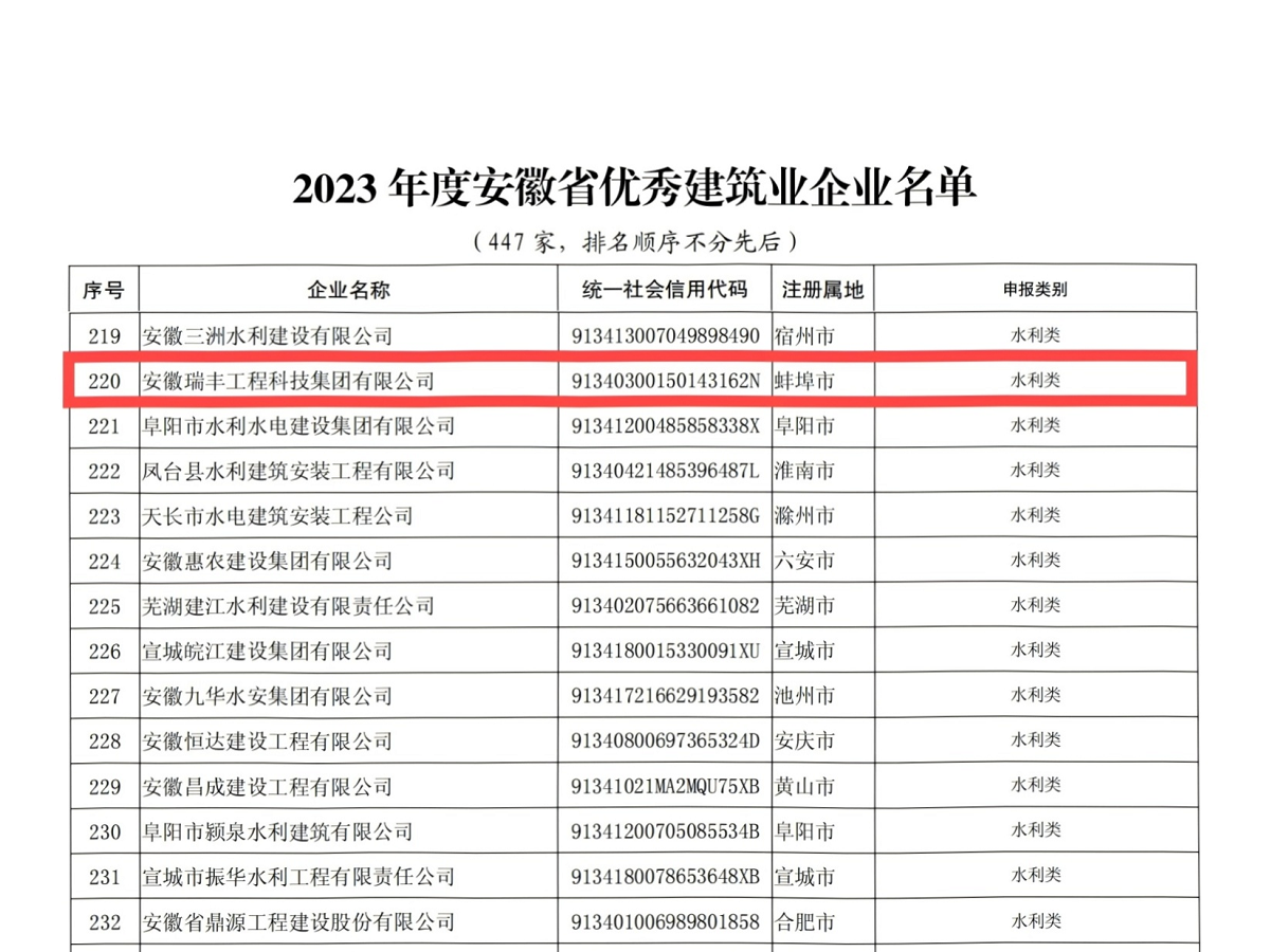 “安徽省優秀建筑業企業”是對全省建筑業企業綜合實力的認定,由省住房城鄉建設廳、省交通廳、省水利廳、省通信管理局共同實施,旨在充分發揮優秀建筑業企業的示范引領作用,提升建筑業企業綜合競爭力,鍛造和打響“安徽建造”品牌。